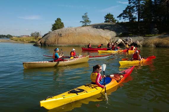 Kun kaikki ovat turvallisesti vesillä, lähdemme oppaan johdolla melomaan pitkin saaristoa.