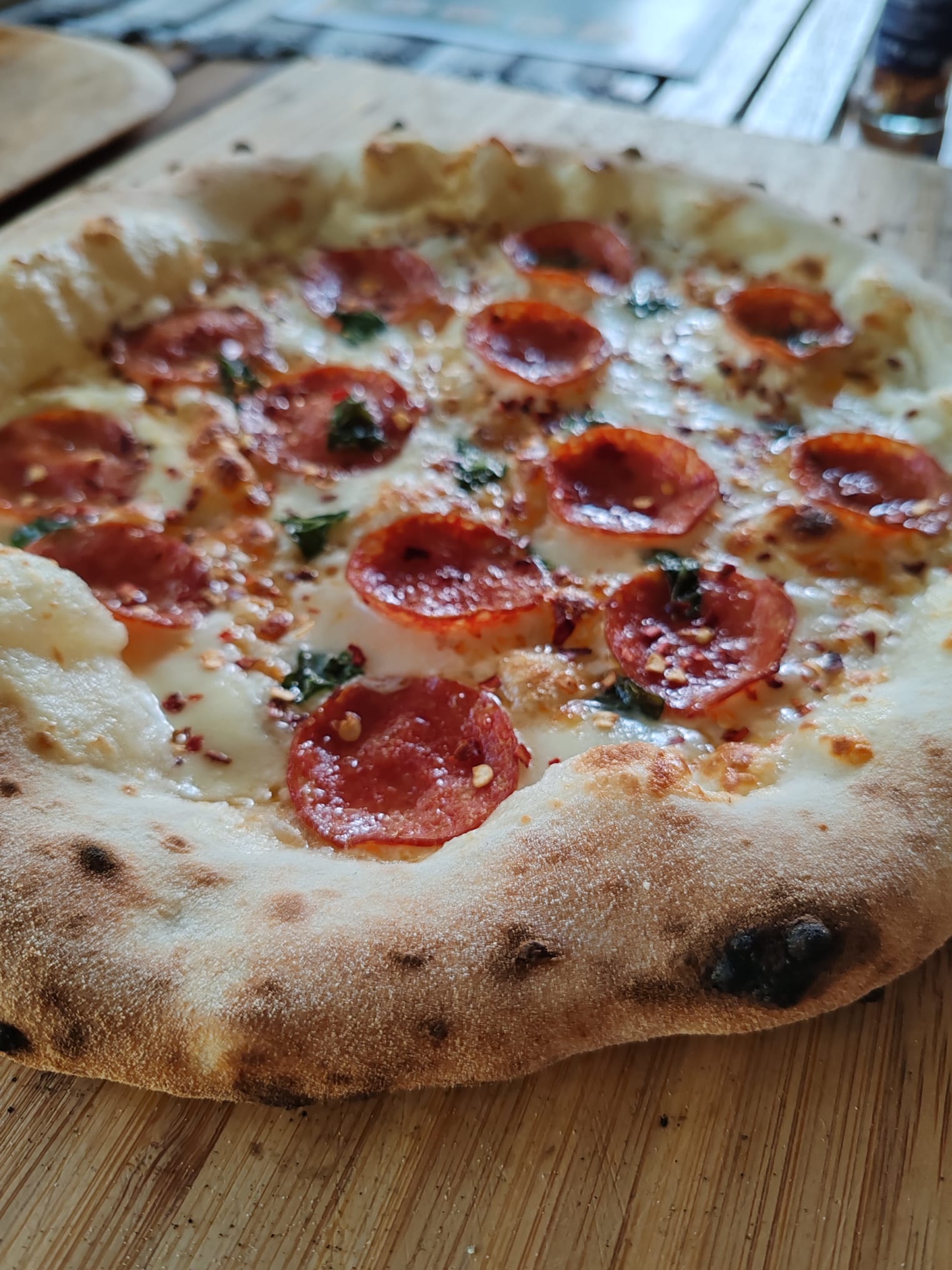 Crème fraîche, färsk mozzarella, chorizosalami, basilika, chiliflakes